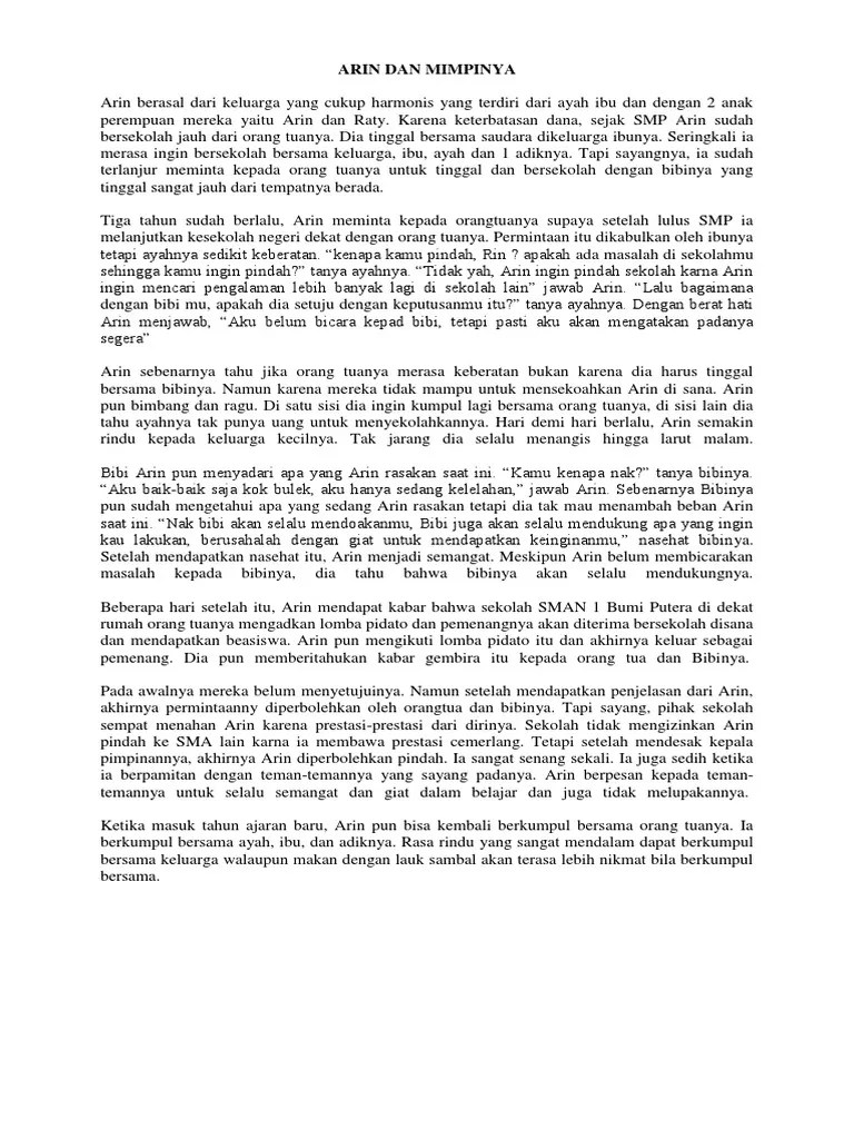 Leny dwi rahayu ukuran : Disini tags:drama sunda santri lucu nganggak, makna cerita cerpen arin dan mimpinya, petualangan cinta hendra. Setelah itu arin mulai menata hidupnya dan merubah strategi untuk mengejar mimpinya. Analisis unsur intrinsik dan ekstrinsik cerpen "arin dan mimpinya". Unsur intrinsik dan ekstrinsik dalam teks cerita pendek. Bagaimanakah perjuangan ipang untuk mewujudkan mimpinya berhaji ? Bacalah kutipan teks cerpen berikut ini! Sinopsis cerpen arin dan mimpinya artikel tugas analisis unsur intrinsik dan ekstrinsik cerpen beserta contoh laporan hasil analisis cerpe1.docx . Arin berasal dari keluarga yang cukup harmonis yang terdiri dari. Mengejar mimpi dan cinta penulis: Pada program studi bahasa dan sastra indonesia fakultas keguruan dan. Pada saat ini admin akan membahas perihal cerpen arin dan mimpinya. Arin yang berasal dari keluarga harmonis yang terdiri dari ayah ibu dan dengan 2 anak .